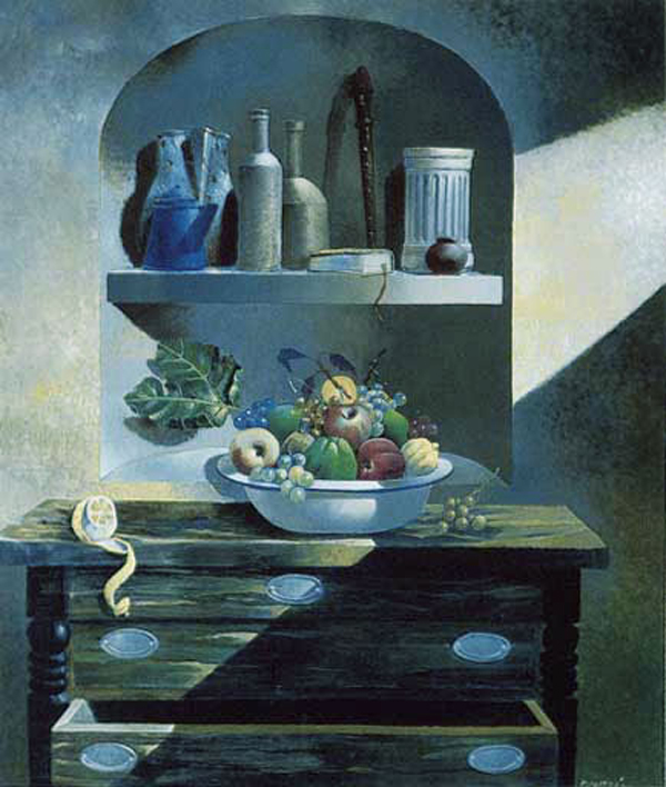 Pescatori rendeva qui esplicita la sua poetica dell'oggetto-stato d'animo, eleggendo addirittura la Canestra di Caravaggio della Biblioteca Ambrosiana - vera insegna del genere nell'unità che la luce vera, chiara e diffusa conferisce alle cose fino a toccare, oltre l'apparenza, la sostanza della realtà gettata in faccia a tutti - a emblema della sua riflessione sulla realtà della pittura, che possa nascondere, nell'intima struttura con cui si fissa nella luce anche la cosa più umile, in una sorta di sospensione metafisica, un'impronta di chiarezza.